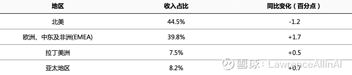 1.新兴市场突破:欧洲、中东及非洲(EMEA)收入占比提升至39.8%,拉美/亚太连续两季超20%增长,收入结构分散度提升