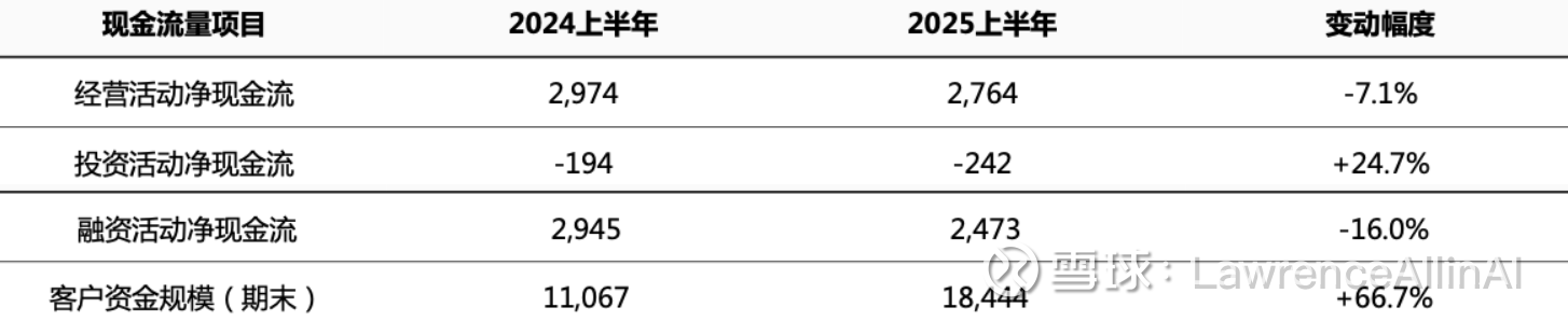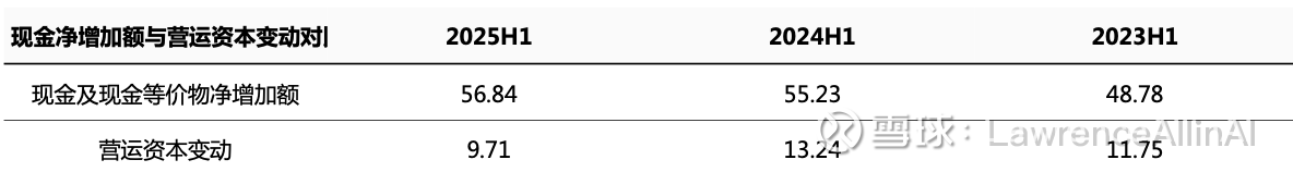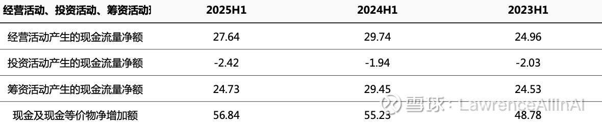 1.现金积累效率提升:现金净增加额连续三年增长(48.78亿→55.23亿→56.84亿),2025H1同比增幅虽放缓至2.9%,但总规模创三年新高,印证现金流管理能力优化。