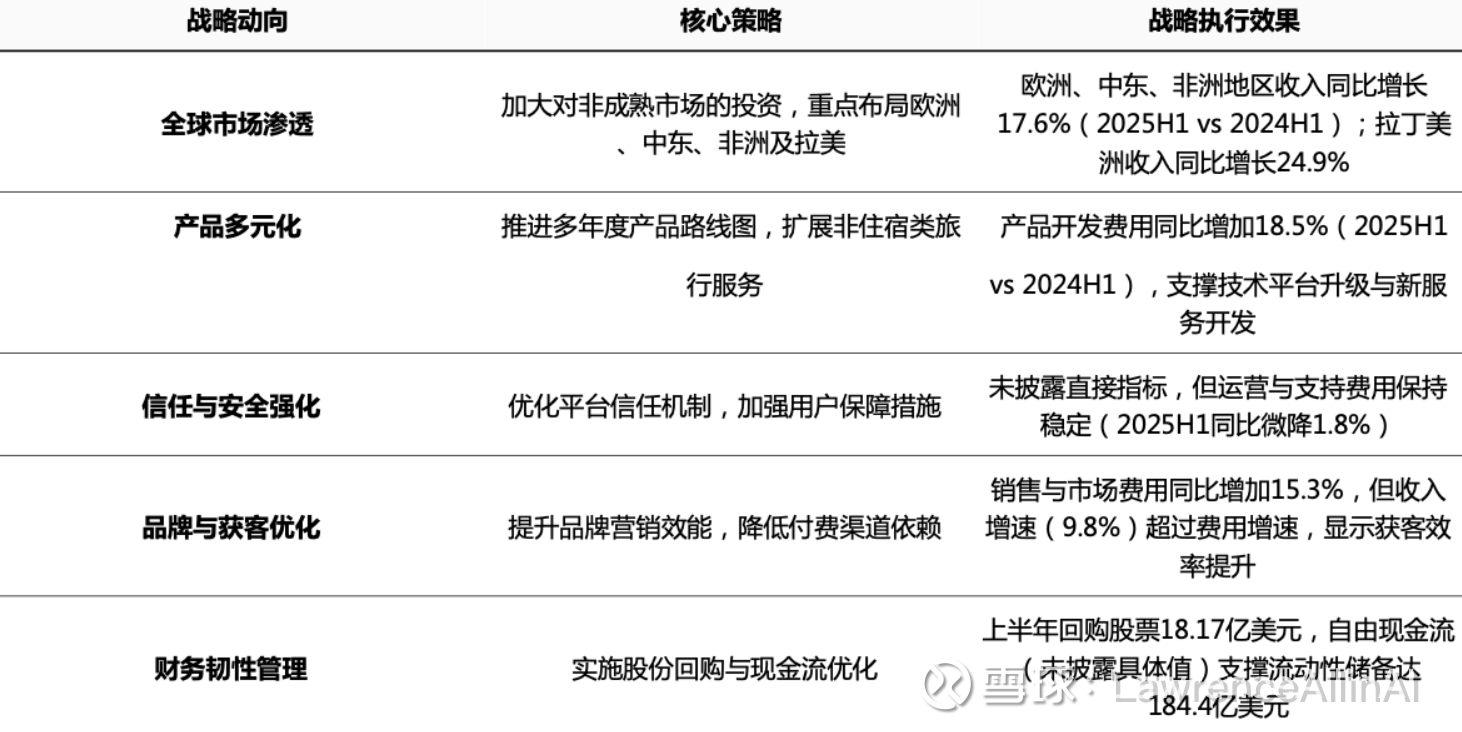 结论:Airbnb在2025H1呈现“技术深耕+区域扩张+财务防御”三重战略特征,既延续共享经济平台的技术驱动本质,又通过新兴市场开拓平衡成熟市场饱和风险,同时以强现金流管理增强抗周期能力,形成攻守兼备的生态布局。