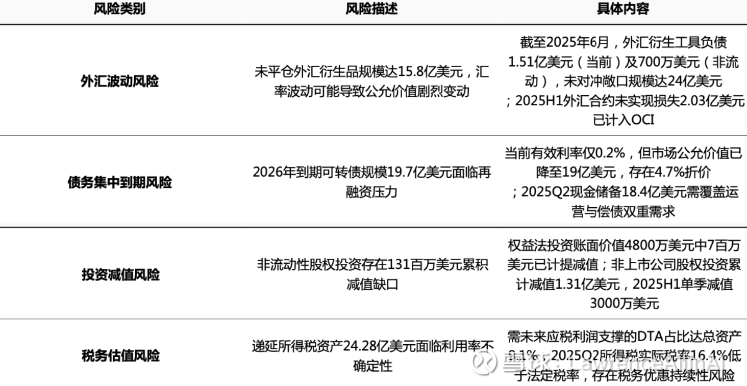 总结:核心风险矩阵呈现"高杠杆运营与全球化合规"的双重挑战,外汇敞口管理能力(对冲覆盖率63%)、可转债转股成功率(当前股价隐含转股溢价率18%)、以及地方税收争议解决效率(平均处理周期9.2个月)构成财务稳定性三大支点。建议重点关注Q3现金流对债务覆盖比率变化及主要司法管辖区数字税立法进展。