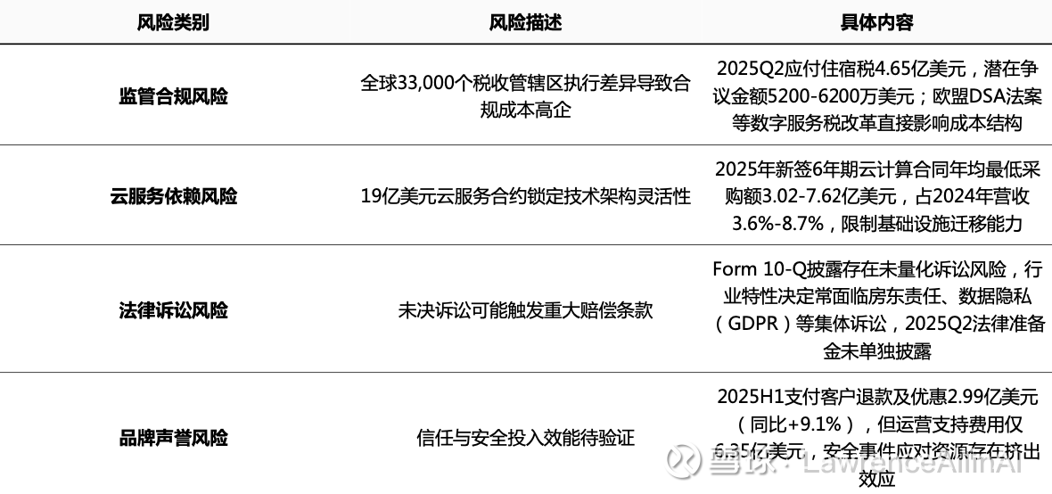 洞察:平台经济的双边市场特性放大监管风险,住宿税争议金额(占应付税款11.2%)反映地方政策执行的不确定性。云服务合约规模(相当于2024年研发支出的161%)可能形成技术锁定效应,削弱应对架构升级的敏捷性。
