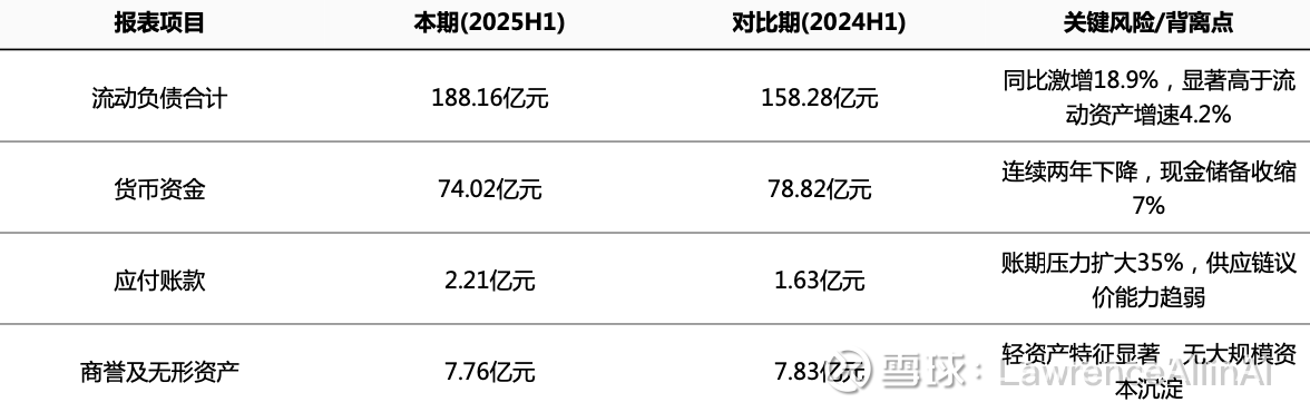 2. 流动负债占比激增(2025H1达97.95%),短期偿债压力显著上升,流动性风险需重点关注。
