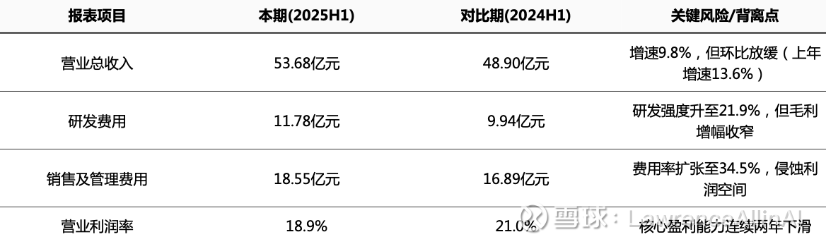 1.费用率高度重合异常:销售费用率与管理费用率连续三年完全一致(如2025H1均为34.56%),疑似合并列报或数据口径异常,需核查报表附注。