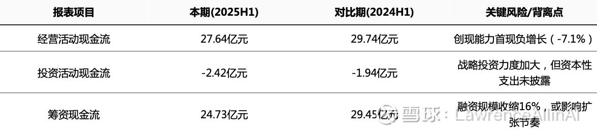 1.经营活动现金流波动性可控:经营活动现金流连续三年保持高位(24.96亿→29.74亿→27.64亿),表明主营业务造血能力稳定,2025H1虽环比下降7%,但绝对值仍显著高于投资与筹资活动。