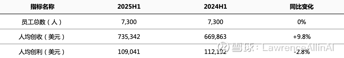 2.利润空间承压:人均创利同比下降2.8%至10.9万美元,与净利润绝对值下降(2025H1 7.96亿vs 2024H1 8.19亿)呼应。可能受成本费用增速(2025H1总成本费用47.2亿,同比+9.9%)快于营收增速影响,需关注费用结构优化空间。
