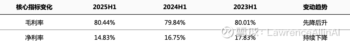1.毛利率在三年间保持80%左右高位波动,2025H1环比回升0.6个百分点,显示核心服务定价能力稳定