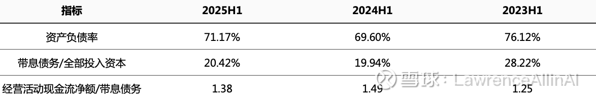 1.债务杠杆波动改善:资产负债率从2023H1高位(76.12%)回落至2025H1(71.17%),债务风险可控但2025H1小幅反弹需警惕。