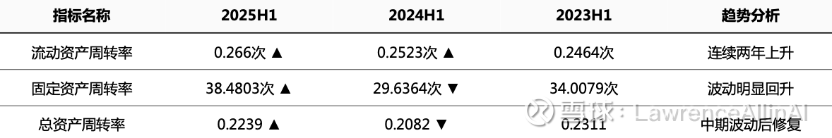 1.流动资产效率持续优化:流动资产周转率连续三年保持增长(2023H1→2025H1:0.246→0.266次),表明企业对现金、存货等流动资产的运营效率逐年提升,资金周转速度加快。