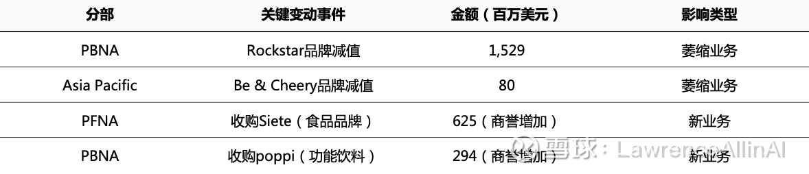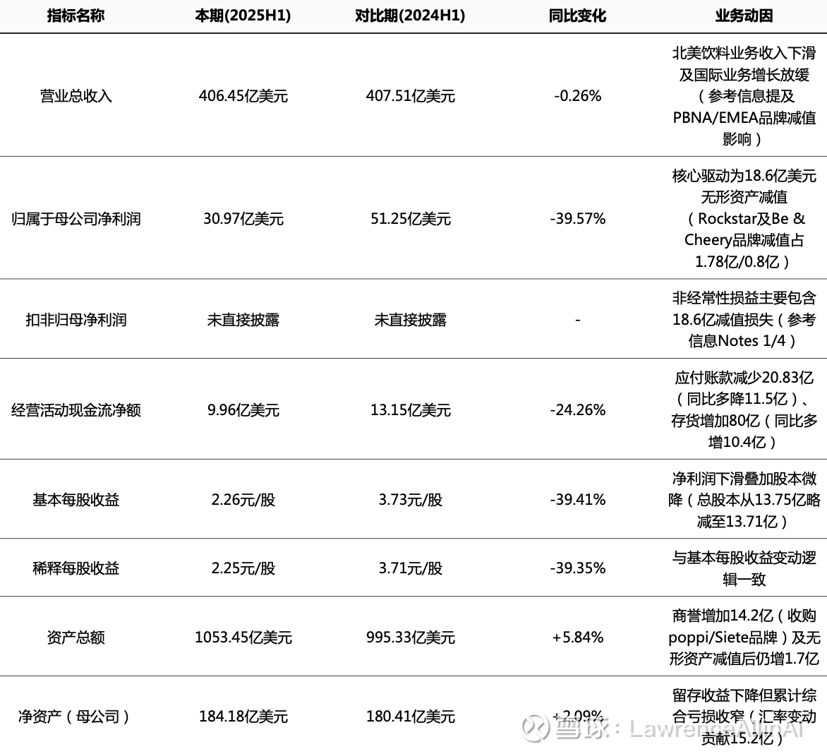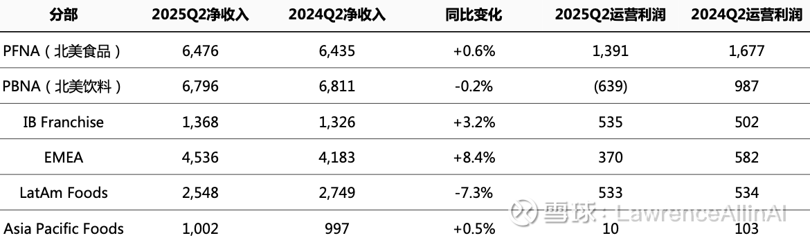 1.PBNA(北美饮料)显著恶化:2025Q2净收入微降0.2%,但运营利润从盈利9.87亿转为亏损6.39亿,主要因1.53亿美元品牌减值(Rockstar品牌)及重组费用。