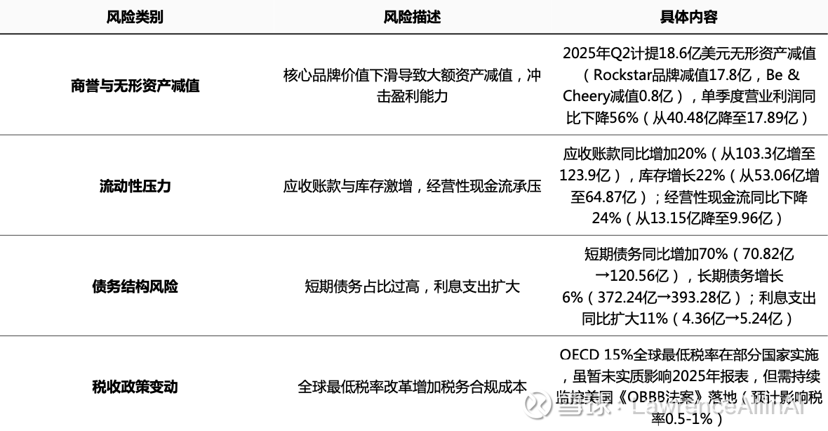 洞察:快消品行业高度依赖品牌资产,Rockstar减值反映能量饮料市场竞争恶化;库存周转天数增加(按年化收入测算从35天升至41天)显示供应链效率下滑,需警惕渠道压货风险。