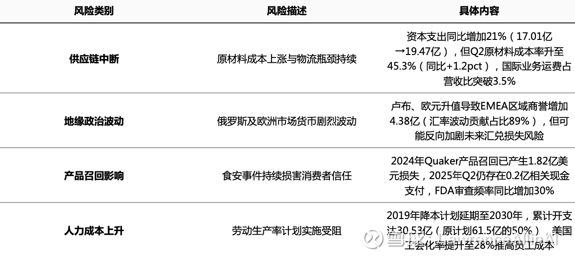洞察:国际饮料业务高度依赖新兴市场(EMEA占国际收入38%),俄罗斯资产占比超15%存在潜在制裁风险;自动化改造进度(仅完成计划50%)显示组织变革阻力较大。