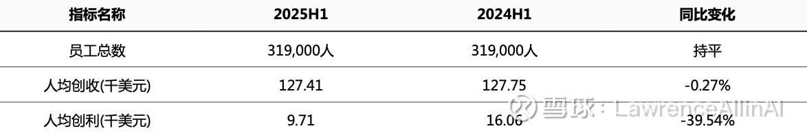 结论:百事2025上半年人效结构呈现"营收稳、利润崩"特征,重大资产减值事件是核心扰动因素。若排除18.6亿非经常性减值影响,调整后人均创利约为14.86千美元,仍较上年同期下降7.5%,反映经营基本面存在边际弱化压力。