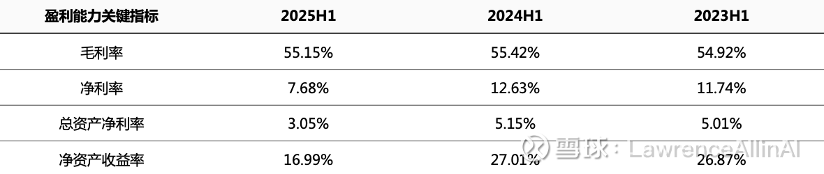 1.盈利能力显著收缩:2025H1净利率同比大幅下降4.95个百分点(12.63%→7.68%),总资产净利率与净资产收益率同步降至3.05%和16.99%,降幅分别达40.8%和37.1%。