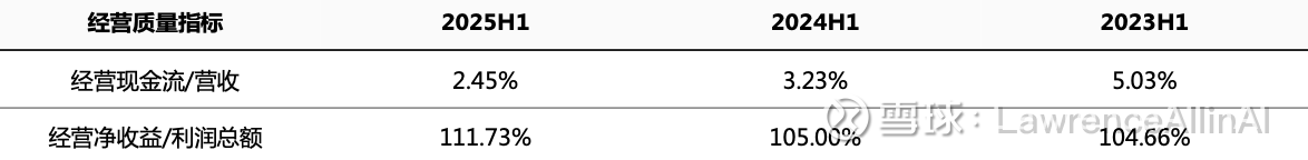 1.现金流恶化加剧:经营现金流占营收比例连续三年下滑,2025H1仅2.45%,较2023H1腰斩,显示盈利质量下降。