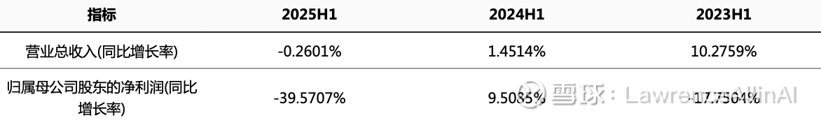 1.收入增长持续收缩:营业总收入增速从2023H1的10.28%大幅下滑至2025H1的-0.26%,反映核心业务增长动力减弱甚至进入负增长区间。