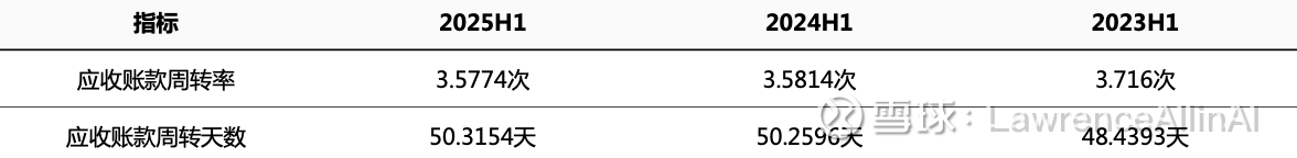 1.应收账款周转效率连续下降:周转率从3.716次(2023H1)降至3.5774次(2025H1),周转天数从48.4天逐年延长至50.3天,表明回款速度放缓,可能影响现金流管理。