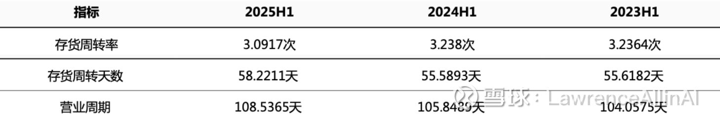 1.存货管理效率下滑:存货周转率持续下降(3.2364次→3.0917次),周转天数从55.6天升至58.2天,或存在库存积压或销售端需求疲软问题。