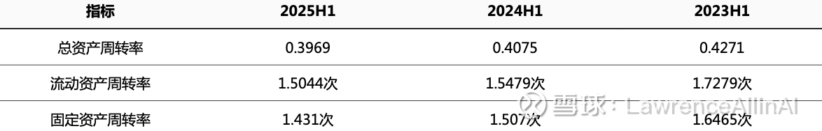 1.全资产类别效率衰退:总资产周转率从0.4271降至0.3969,流动资产与固定资产周转率分别下降14.8%和13.1%,反映资产使用效率整体下降。