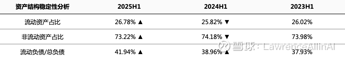 1.流动资产占比连续三年稳定在25%-27%区间,2025H1微增0.95个百分点,显示运营资金管理相对保守