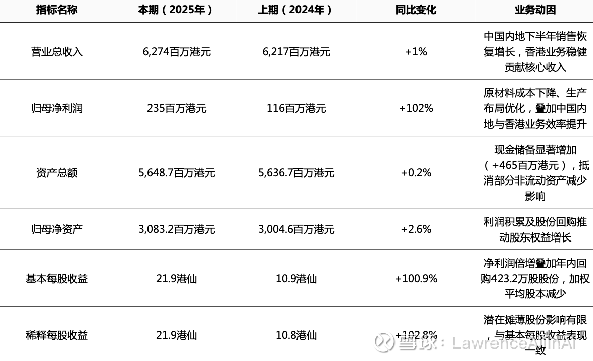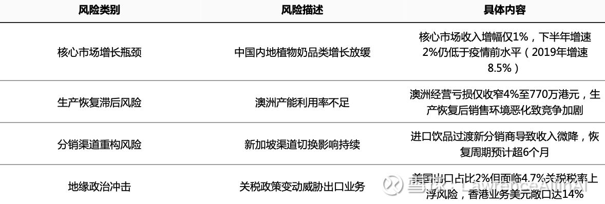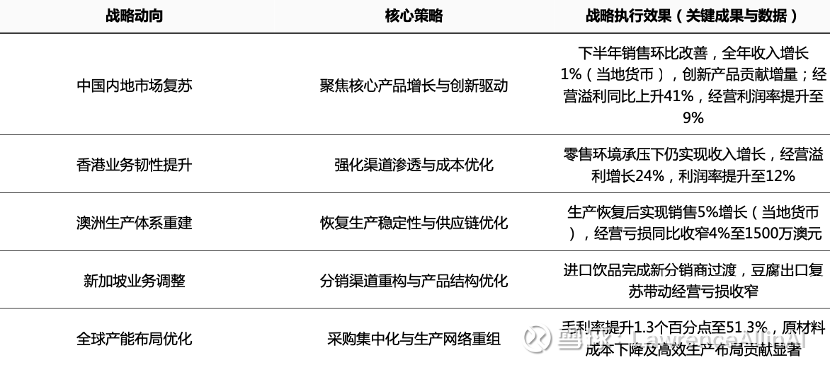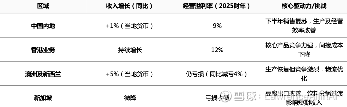 结论:核心市场(中国内地+香港)持续夯实基本盘,通过生产优化和渠道精耕实现利润倍增;海外市场处于战略调整期,澳洲生产恢复带来减亏曙光,新加坡分銷过渡阵痛后将迎来转机。