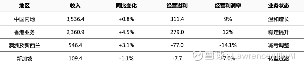 1.区域市场结构性分化:中国内地及香港为核心盈利引擎,贡献主要利润增量;澳洲及新西兰仍处调整期,但亏损收窄显示边际改善。
