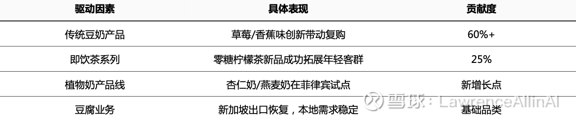 结论:"经典产品创新化+健康概念产品矩阵"策略成效显著,核心豆奶/茶饮持续迭代保持竞争力,植物奶新品打开未来增长空间,生产端效率提升夯实盈利基础。