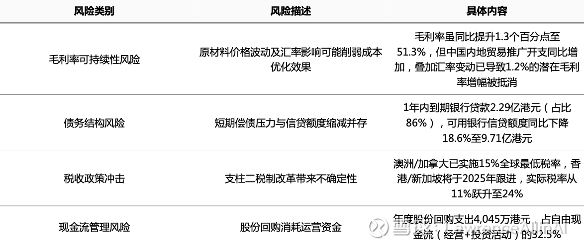 总结:建议优先优化中国内地渠道效率(当前经营利润率9%低于香港12%),建立汇率对冲机制(美元负债占比23%),并在东南亚市场加速本地化生产布局(新加坡工厂利用率仅65%)。需密切关注支柱二税制对澳新地区税负的影响(递延税项资产2.26亿港元面临重估风险)。