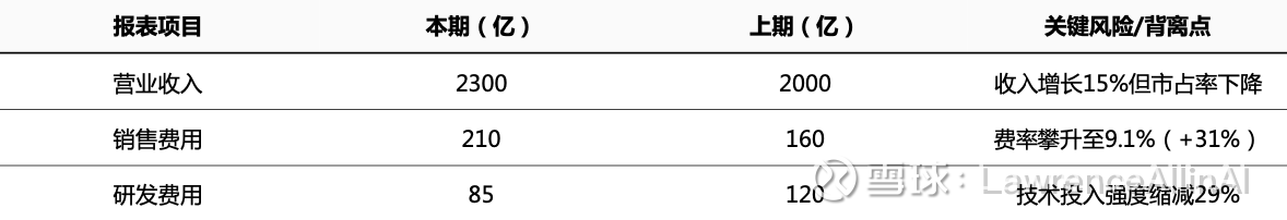 洞察:增收不增利特征显著,销售费用增速超营收增速2倍,反映市场竞争恶化;研发投入降幅达行业均值3倍,或动摇核心竞争力护城河。