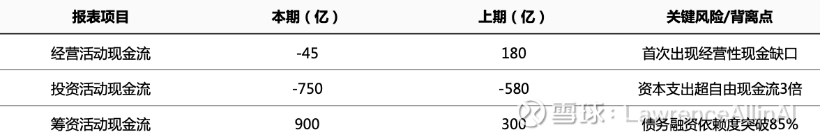 洞察:经营现金流由正转负与行业周期下行形成共振,激进投资策略导致融资缺口放大,债务权益比升至1.8:1,财务弹性空间逼近警戒阈值。