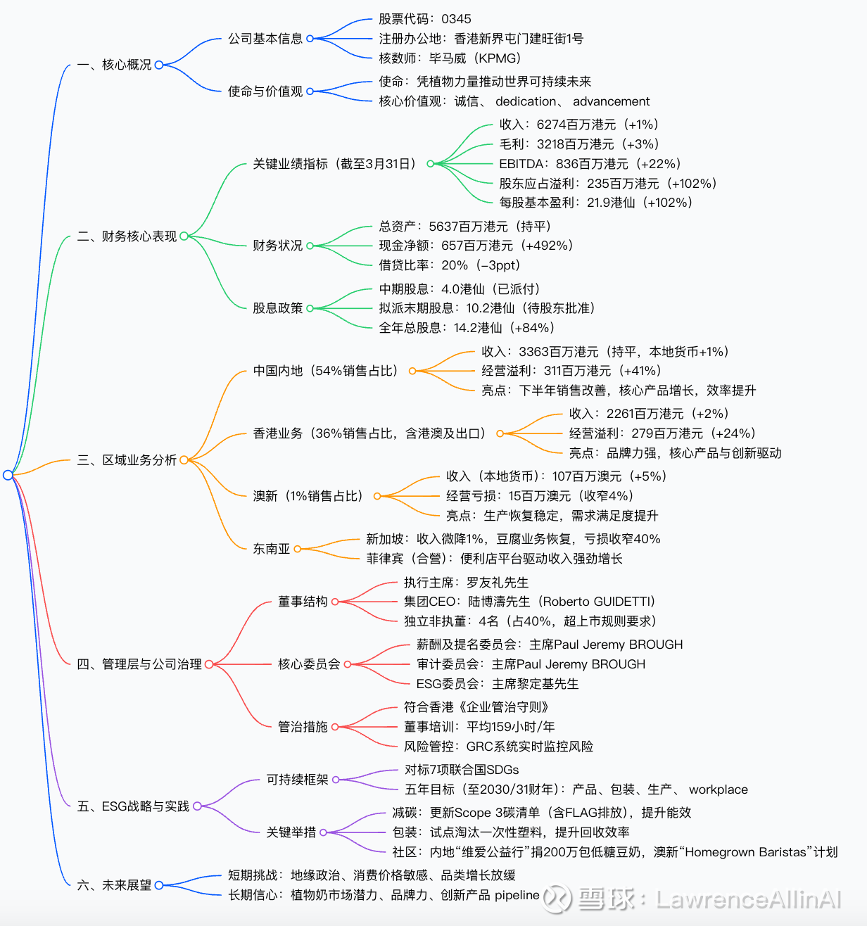 结论:维他奶通过"核心市场精耕+供应链效率革命"的双重战略,在行业增速放缓背景下实现盈利能力的结构性改善。中国内地市场复苏与香港业务韧性构成增长基石,生产体系重构与成本优化则为中长期盈利提升奠定基础,但需关注澳新市场扭亏进度及创新产品持续迭代能力。