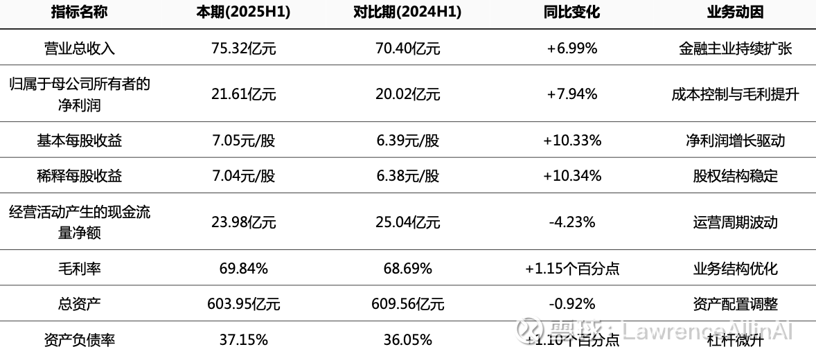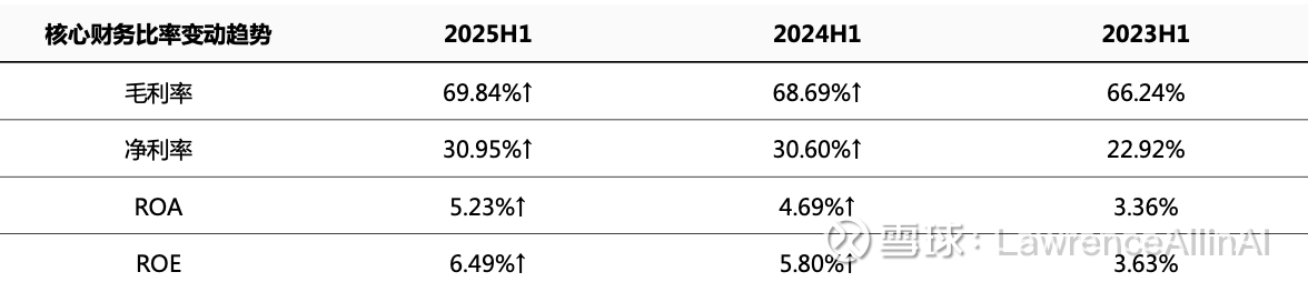 1.盈利质量提升:毛利率连续三年增长(2023H1:66.24%→2025H1:69.84%),体现核心业务竞争力增强。