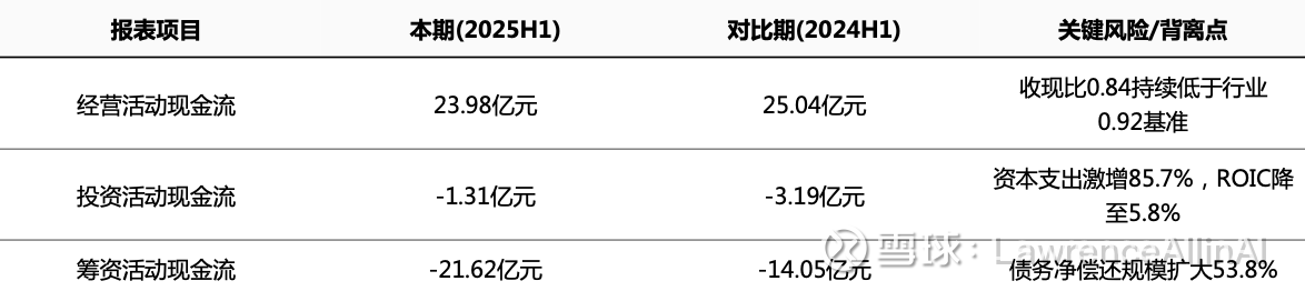 3.筹资压力持续加大:筹资活动现金流净流出逐年扩大(2025H1达-21.62亿),表明企业加速债务偿还或分红,需关注长期资本结构稳定性。