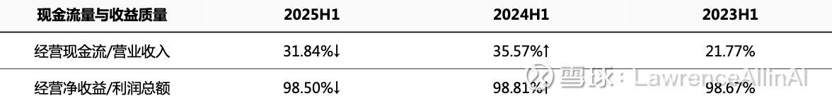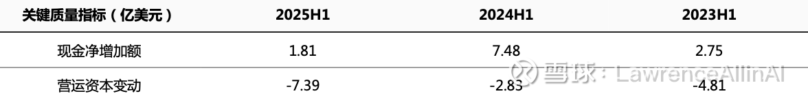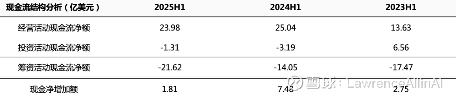 1.经营造血能力波动但整体稳健:经营活动现金流净额2023H1至2024H1增长83.6%,2025H1虽小幅下降4.2%,仍保持较高水平(23.98亿美元),反映核心业务造血能力较强。