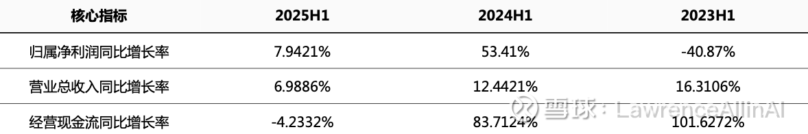 3.现金流与盈利背离:经营现金流增速从101.63%(2023H1)降至-4.23%(2025H1),与净利润增长方向相反,或存在应收/应付账款管理或投资活动影响。