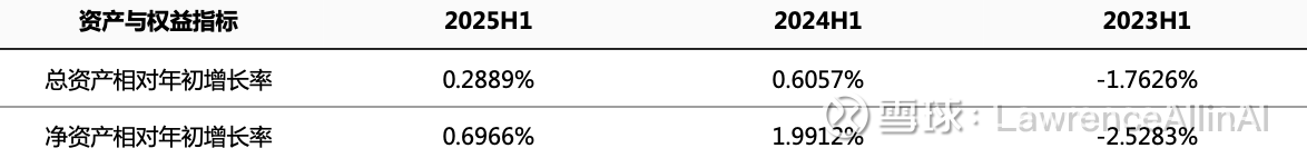 1.资产扩张动能衰减:总资产增速从2024H1的0.61%降至2025H1的0.29%,显示规模扩张放缓,可能与金融行业资产配置策略调整有关。