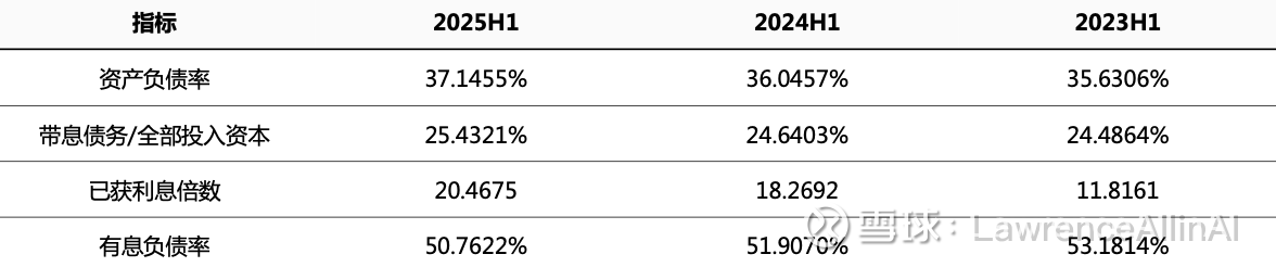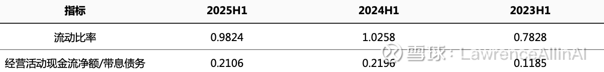 2.经营活动现金流/带息债务比率改善显著(0.12 → 0.21),经营性现金流对债务的支撑能力翻倍,但2025H1较上年略有下降需持续关注。