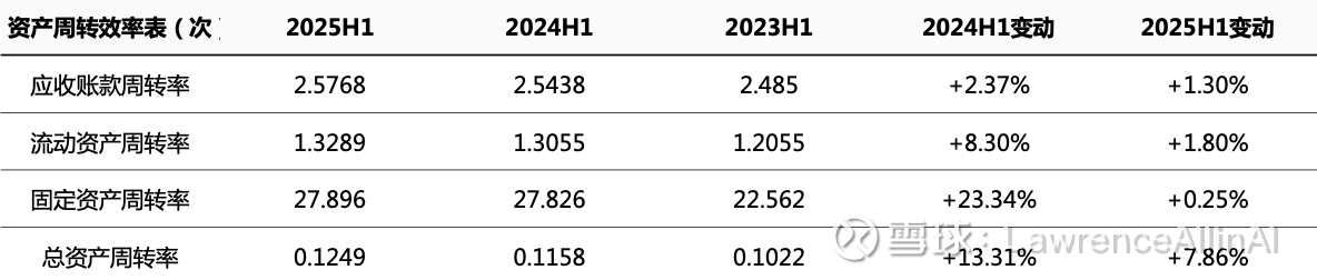 1.资产周转效率全面提升:2023H1至2025H1,四项周转率连续两年正向增长,其中固定资产周转率2024H1同比大幅提升23.34%(基数低),反映资产配置优化;流动资产与应收账款周转率增速放缓但仍保持稳健。