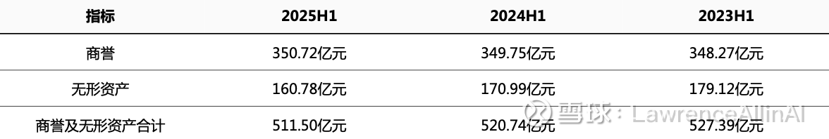 1.商誉规模稳定(3年波动<1%),但无形资产持续下降,2025H1较2023H1减少10%,或反映技术资产摊销压力。