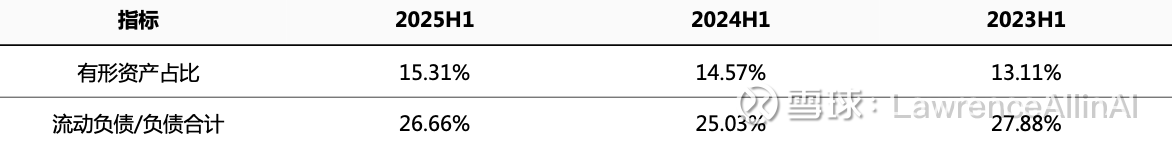 1. 有形资产占比连续三年提升,2025H1达15.31%,资产结构稳健性增强。