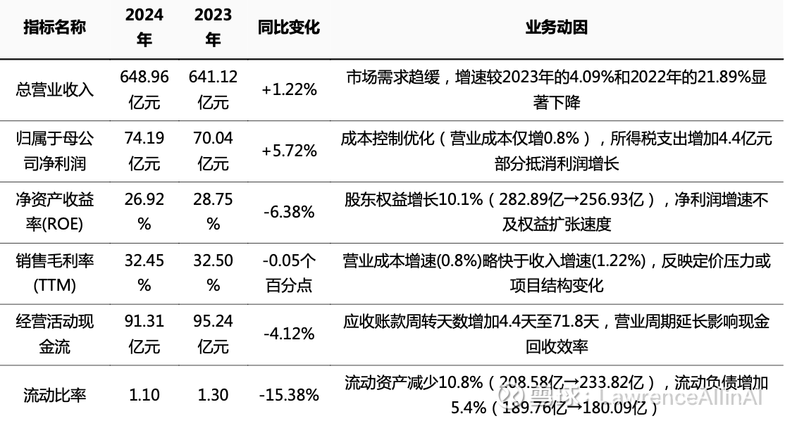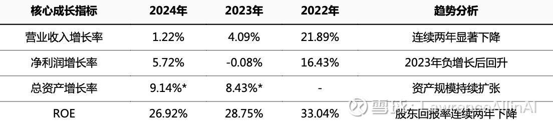 1.盈利质量提升:净利润增速(5.7%)显著高于收入增速(1.2%),显示运营效率改善,但ROE下降揭示资本使用效率待提升