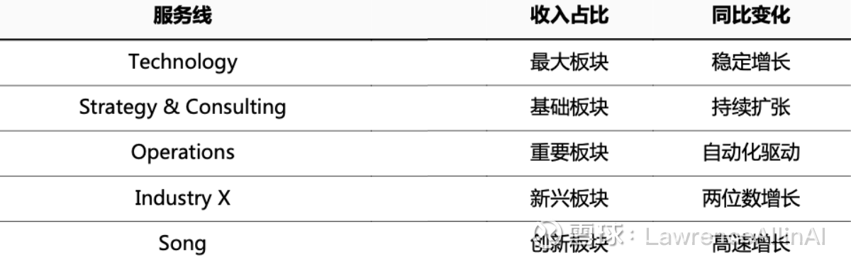 结论:Accenture通过"技术+行业"双轮驱动实现均衡增长,新兴业务(Industry X/Song)和区域市场(亚太/拉美)成为新引擎。核心竞争优势体现在:1)政企客户深度绑定能力 2)智能制造和体验经济先发优势 3)全球交付网络重组带来的运营效率提升。需关注传统金融业务增速放缓带来的结构性调整压力。
