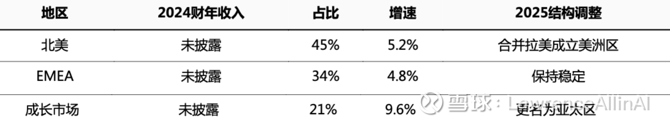 2.交付网络动态重构:市场单元重组(拉美并入北美、亚太独立)反映对区域经济格局的前瞻预判,2024年北美市场贡献43%营收印证结构调整成效。