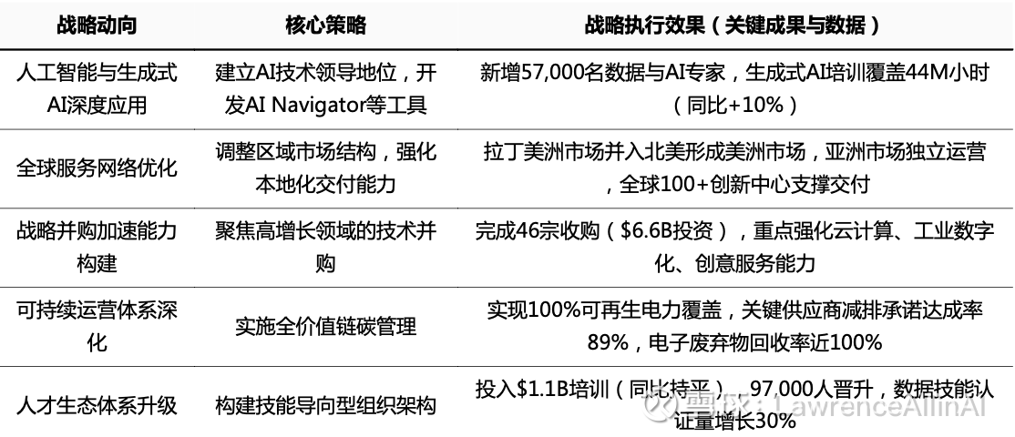 结论:Accenture通过"技术投资+生态整合+人才运营"的三维战略,在保持传统咨询优势的同时,成功将AI能力转化为新的增长引擎,其全球服务网络的动态调整与ESG深度整合策略,为应对复杂市场环境构建了独特的抗周期能力。