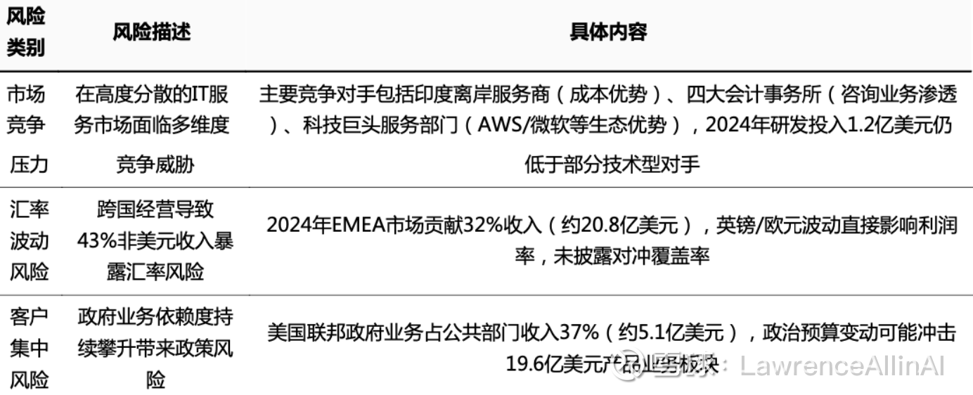 洞察:专业服务行业轻资产模式下,客户续约率(前100大客户合作超10年)虽形成护城河,但政府业务占比过高可能削弱抗周期能力,需关注2025年美洲市场重组后的区域收入结构调整。