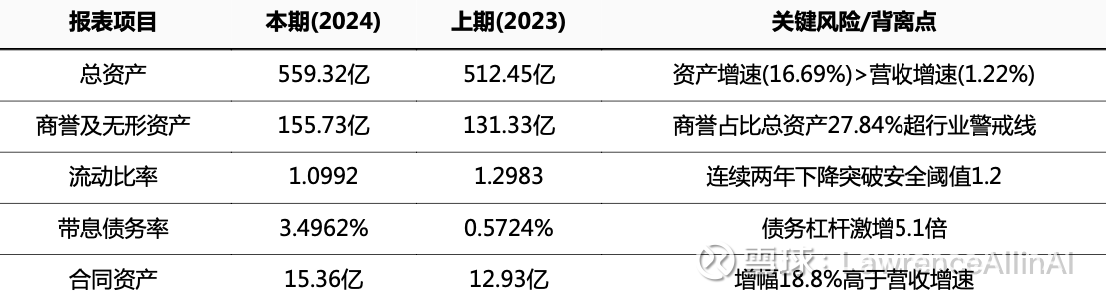 3.商誉风险积聚:并购形成的商誉及无形资产占比达28%,流动比率跌破1.1警戒线,短期偿债能力亮红灯
