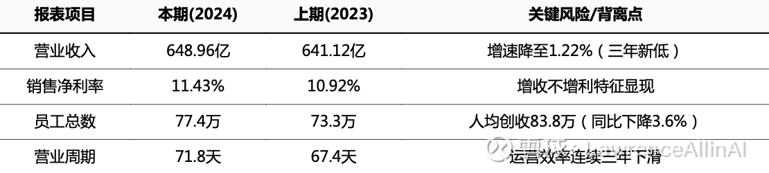 2.员工规模扩张速度(5.6%)远超收入增速(1.2%),需警惕人均产出下降风险