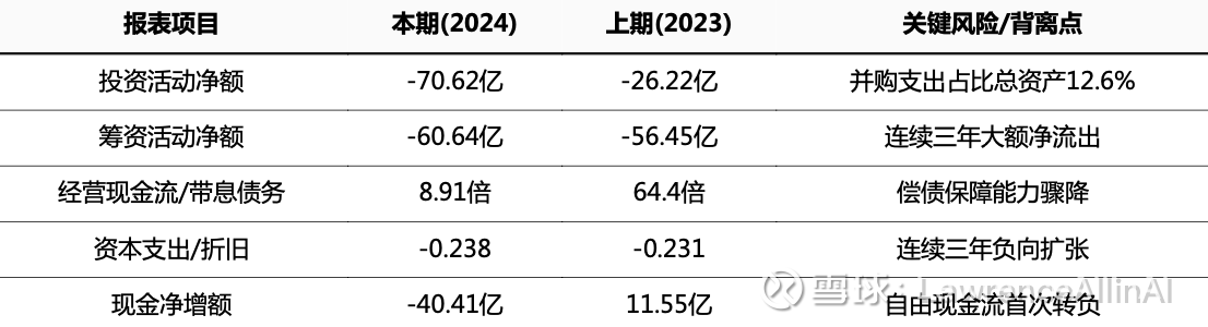 洞察:并购驱动的投资支出激增169%,但资本支出/折旧比持续为负,显示资产更新能力不足。经营现金流覆盖带息债务能力断崖式下跌,货币资金较峰值缩水44.7%,现金储备安全边际削弱。