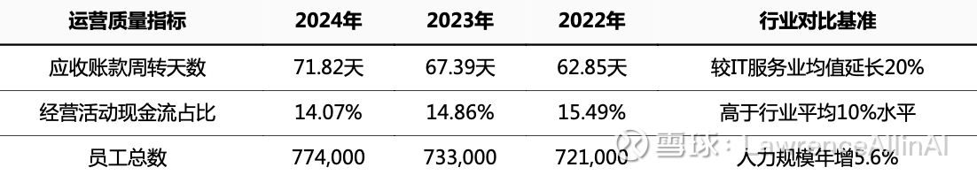 洞察:人力密集型特征下,员工规模扩张5.6%但营收仅增1.2%,显示规模效应递减。营业周期延长反映项目交付效率下降,与数字化转型服务商的行业定位形成矛盾。