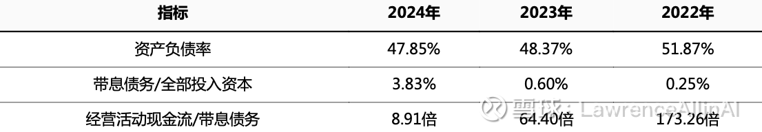 3.主动收缩负债:连续三年筹资现金流净流出,2024年带息债务率升至3.83%(前两年均低于1%),但绝对值仍处低位,显示审慎的资本结构管理。