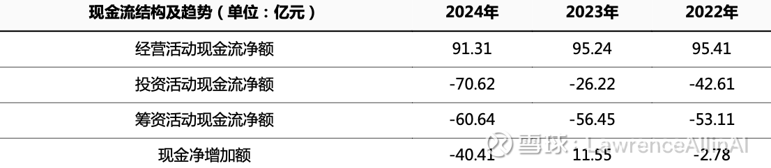 2.现金储备较2023年骤降44.7%,但经营活动现金流仍维持91亿规模,核心造血能力稳定